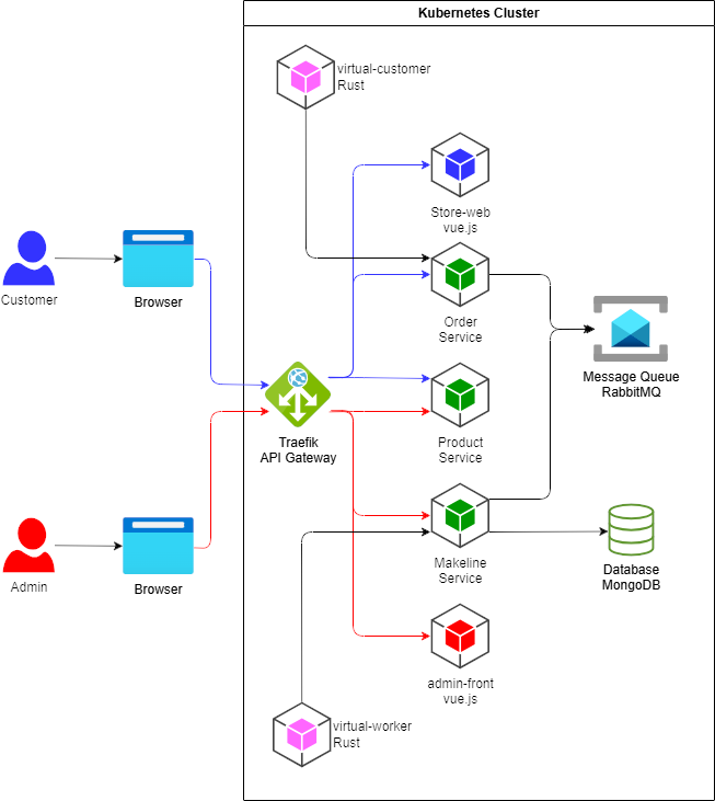 Próbáljuk ki az alkalmazást a http://localhost:32080/admin címen, és vegyük észre, hogy a megrendelések automatikusan érkeznek a virtuális vásárlóktól és lezárulnak a virtuális dolgozók által.