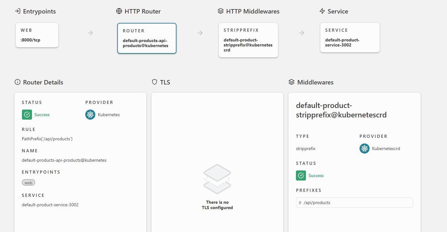 product-serviceszolgáltatás nem a/api/productsútvonalon várja a kéréseket, hanem a/útvonalon. A/api/productsútvonalat csak a frontend ismeri. Ezt a problémát a Traefik middleware funkciójával tudjuk megoldani. A middleware-ek a Traefik-ben olyan komponensek, amelyek a bejövő kéréseket módosítják, mielőtt továbbítanák azokat a backend szolgáltatások felé. A Traefik-ben van egy StripPrefix middleware, amely eltávolítja a megadott prefixet a kérés URL-jéből. Ezt a middleware-t kell alkalmaznunk aproductsIngress-re. -